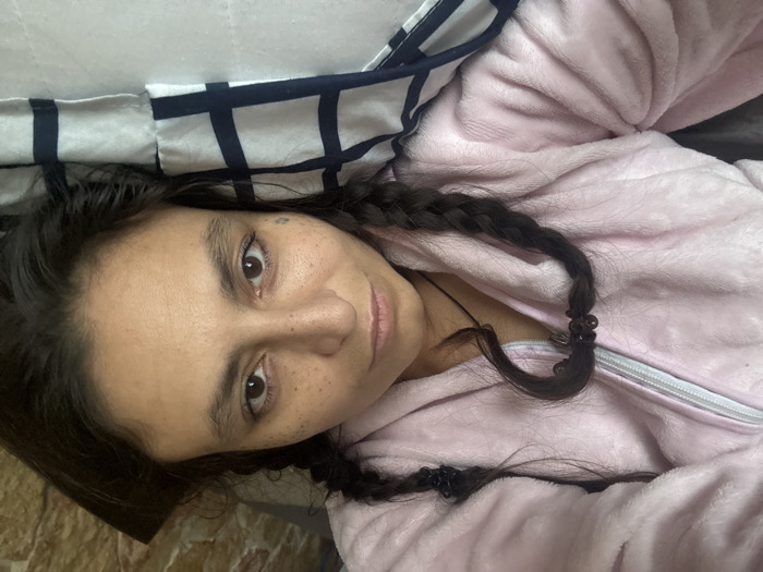 The image depicts a single individual, an adult female, lying indoors, angled towards the viewer. She has dark hair styled in two braids, secured with dark hair ties, resting against a light pink, plush zippered garment. Her face features freckles on the nose and cheeks, brown eyes looking directly forward, and light pink lips. A small, dark, irregular mark is visible on her upper left cheek. Her head rests on a white pillow with a dark blue grid pattern, set against a white bedsheet. A textured wall with earthy-toned, possibly stone or brick-like material is visible in the background. The precise location within Moscow, Russia, cannot be determined from the visual information present in the image.