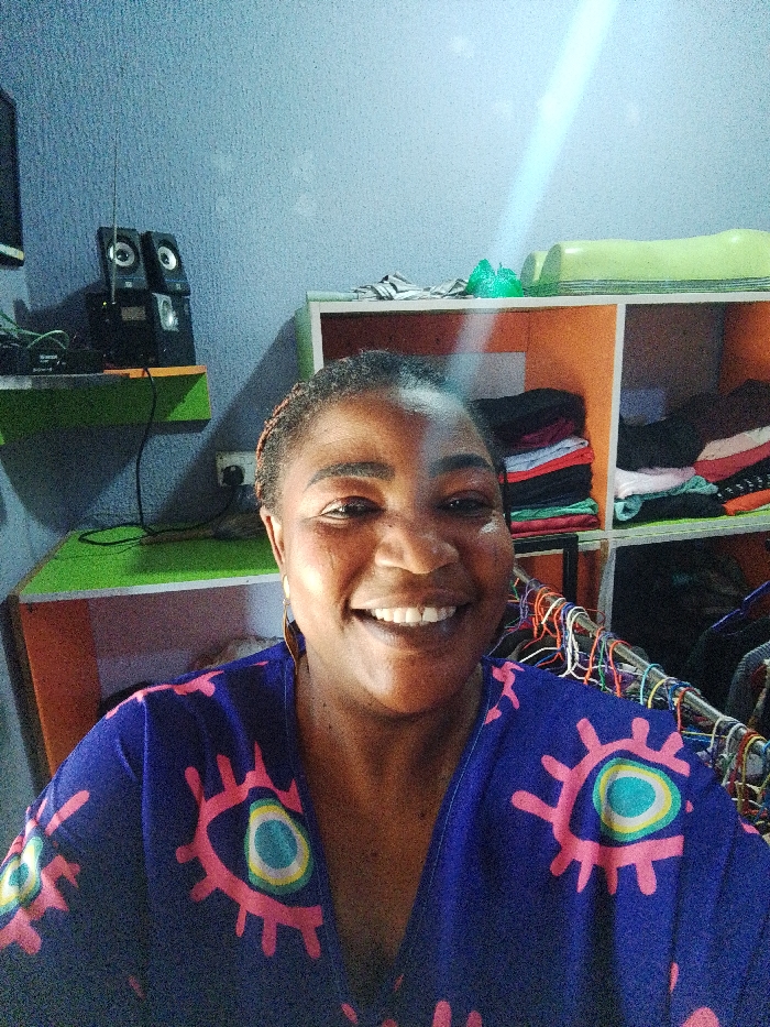 smiling Black adult female in an indoor setting. She is centered in the foreground, facing the camera directly, wearing a blue V-neck top with a repeating pink, yellow, and blue-green stylized eye pattern. Her hair is styled in short braids or twists, and she exhibits a wide, toothy smile. The background features a light blue, textured wall. To the left, a partial television screen is visible above a bright green floating shelf. This shelf supports two dark speakers, an electronic device, and connecting cables. Below this, a second bright green shelf, bordered by an orange panel, is present, along with a white electrical outlet. To the right of the subject, a white and orange shelving unit contains neatly folded clothes in multiple colors. The top shelf holds a light green curved object and a small, reflective green item. Partially visible below the shelving unit is a clothing rack laden with numerous colorful plastic hangers. A diagonal lens flare traverses the upper portion of the image, originating from the upper right. The scene appears to be an interior room, potentially a residence or a small retail space. Location: Unknown, Unknown.