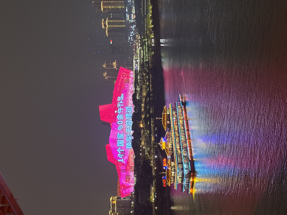 The image depicts a nighttime urban river scene in Yuzhong District, China. A large, angular building on the elevated riverbank is intensely illuminated in a vibrant pink-magenta hue. Projected onto its facade in blue light are Chinese characters which translate to "World Art Exhibition, 10+ countries, 80+ artworks, don't miss the splendor." Below this structure, terraced landscaping with smaller illuminated elements is visible. In the background, across the river, a dense cluster of illuminated high-rise buildings defines the city skyline. A multi-decked passenger cruise ship navigates the dark water in the midground, moving from left to right. The vessel is extensively lit with colorful LED lights, including blue, red, yellow, and orange, which reflect vividly on the water's surface, creating elongated streaks of light. The ship features traditional Chinese architectural elements on its upper decks, including ornate, curved roofs, and prominently displays Chinese characters, likely its name, "重庆红" (Chongqing Red), on signage. Passengers are visible on the various illuminated decks of the ship. The upper left corner of the frame shows a dark, structural element, possibly part of an overhead bridge, partially obscuring the sky. The sky above the city is dark.