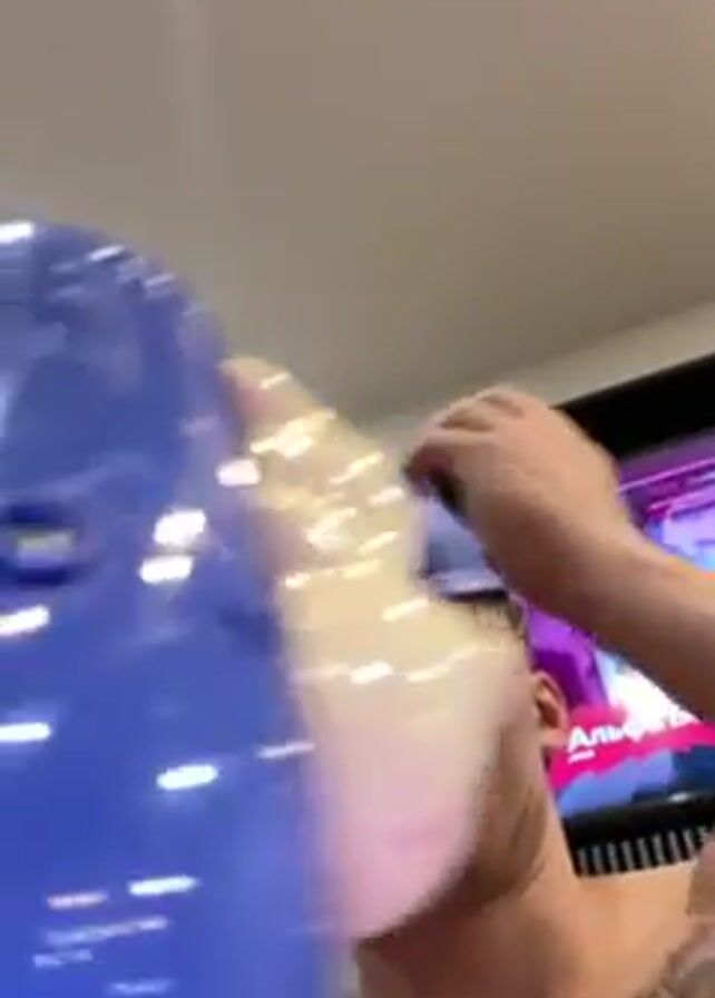 A shirtless man with a blue cap and tattoos takes a selfie video with a blue plastic device with a white hippopotamus figure attached to the top. The device is humming. The man appears to be inside a house. There is a television visible in the background.