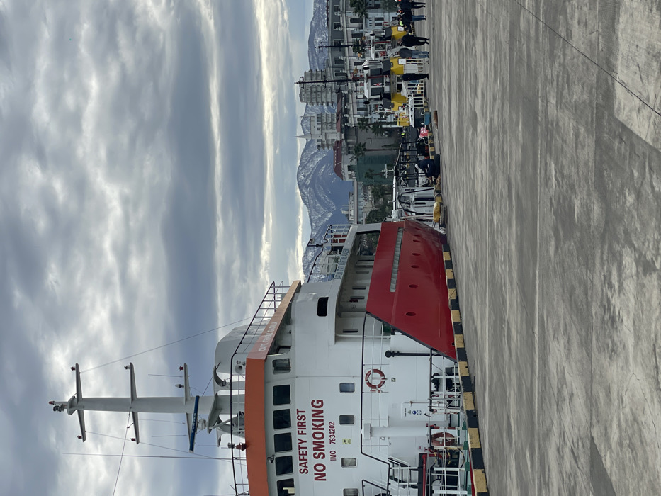 The scene depicts a maritime pier in Batumi, Georgia, under an overcast sky. A large vessel, predominantly white with a prominent red hull section and orange trim, is docked on the left. The vessel's superstructure displays "SAFETY FIRST NO SMOKING" in red lettering, along with "IMO 7634202" and "CAPT. TENGI GABILA." The text "BATUMI STATE MARITIME ACADEMY" is also visible on its side. A mast with a Furuno radar unit is present on the vessel's upper deck. The foreground consists of a grey concrete pier with yellow and black striped bumper blocks lining the edge where the vessels are moored. In the mid-ground, a group of approximately 5-7 individuals are walking away from the camera on the pier. Adjacent to the main vessel, several white structures and a black tire are visible on the pier, with one individual appearing to be crouched or working near them. Further along the pier, other smaller vessels, including one with yellow and black coloring, are docked. The background features snow-capped mountains in the distance, partially obscured by cloud cover. Between the pier and the mountains, various urban buildings are visible, including one prominent structure with a spire and several palm trees.