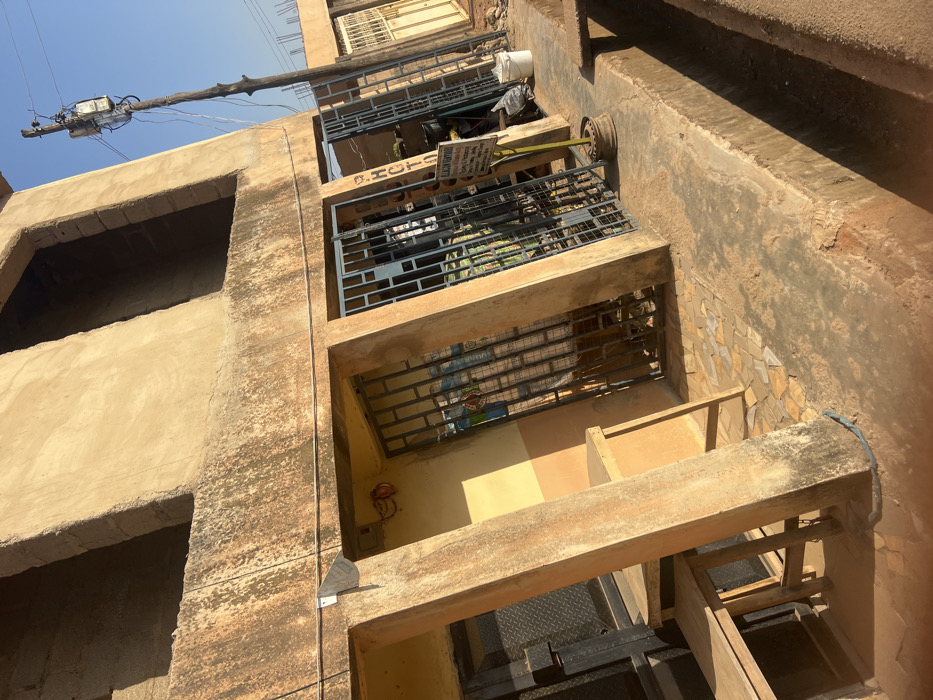 The image depicts a static street scene in Barakin Akawo, Nigeria, under bright daylight. The primary subject is a two-story, unpainted or light-brown colored concrete building, exhibiting significant weathering and discoloration. The upper floor of the building features two large, rectangular, open apertures lacking glazing or frames, suggesting an unfinished or disused state. The ground floor consists of multiple commercial storefronts or entrances, each secured by dark metal grates. The leftmost visible entrance is fronted by a dark, possibly corrugated, metal door. The two central entrances feature blue-grey metal security grates, with the interior of the middle entrance revealing stacked items and a multi-colored fabric or banner. In front of the central entrances, a white rectangular sign with black text, titled "PHOTO" and "BLACK ENTERPRISE," lists services such as "Virtual ID Card," "Passport," "Digital Passport," "Printing," "Laminating," "Scanning," and "All type of Computer work." This sign is affixed to a green pole, which is stabilized by being set into a car wheel rim on the ground. Two light-brown wooden tables or benches are positioned under the building's overhang near the leftmost entrance. An electrical junction box and red wiring are visible on the building facade above this area. A small section of decorative brown/tan tiling covers the ground directly in front of the central entrances, contrasting with the reddish-brown unpaved earth surface of the adjacent street. A concrete gutter or drainage channel runs parallel to the building in the foreground. To the right, a wooden utility pole supports a grey electrical transformer and multiple overhead wires against a clear, blue sky. A white bucket rests on the unpaved ground near the rightmost entrance. No individuals are visible in the scene.