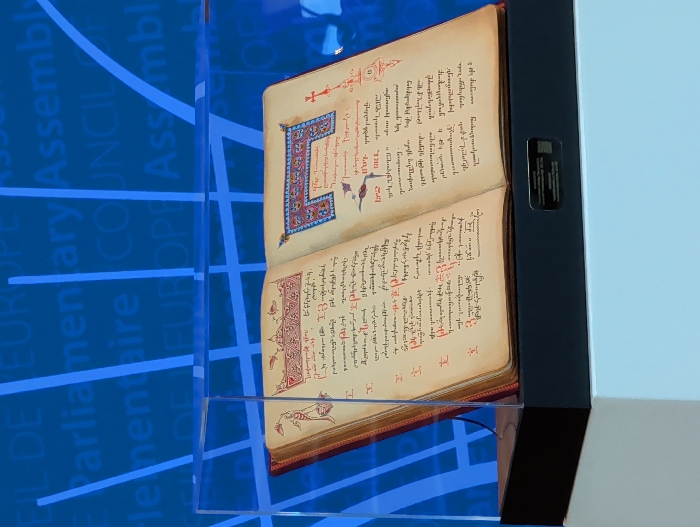An open, illuminated manuscript is displayed within a transparent protective case, positioned on a dark rectangular plinth that rests on a lighter-colored pedestal. The book is open to two facing pages, featuring handwritten script predominantly in dark ink, with significant sections, including headings, initial letters, and marginal annotations, rendered in red ink. Both pages exhibit intricate, colorful illuminations and decorative borders, utilizing red, blue, and gold tones. The book's spine, visible on the left, is red. A small, dark rectangular plaque is affixed to the front of the dark plinth. The background is a deep blue surface displaying partially visible white or light blue text, including "COUNCIL OF EUROPE" and "Parliamentary Assembly," indicating the location as the Council of Europe building in Strasbourg, France. No individuals or active interactions are depicted.