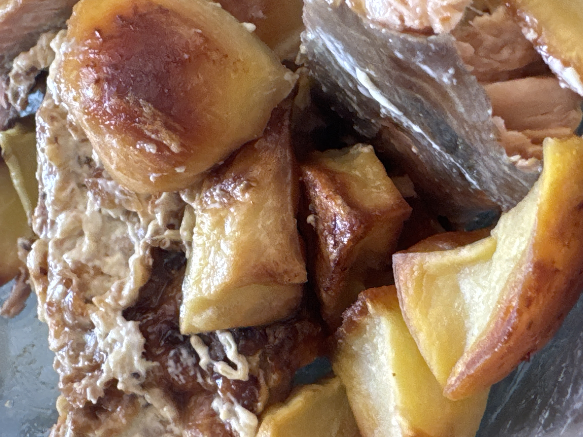 close-up of cooked food, possibly a mix of fried potatoes, fried fish, and some kind of creamy sauce-covered fried dish