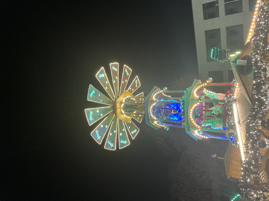 A Christmas pyramid stands against a dark night sky, partially illuminated. The pyramid features a star-shaped fan on top and multiple levels with figures. The fan's blades are adorned with shooting stars. Bright lights illuminate the pyramid's structure and the figures inside. A building is seen in the background. The pyramid is part of a Christmas market.