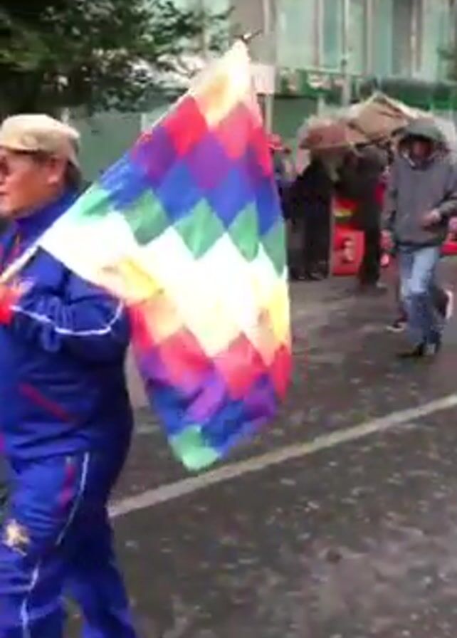 A group of people is marching down a wet city street. They are carrying a banner that says "TRABAJADORES MINAZA" in large letters, followed by "23 NOVIEMBRE DEL 2..." in smaller letters. Some people are carrying flags, including one with a colorful, checkered design. Many of the marchers are wearing red hats or jackets, and some are carrying umbrellas or wearing rain gear. The street is lined with buildings, and there are trees visible in the background. The video is slightly shaky, as if it was taken while walking.