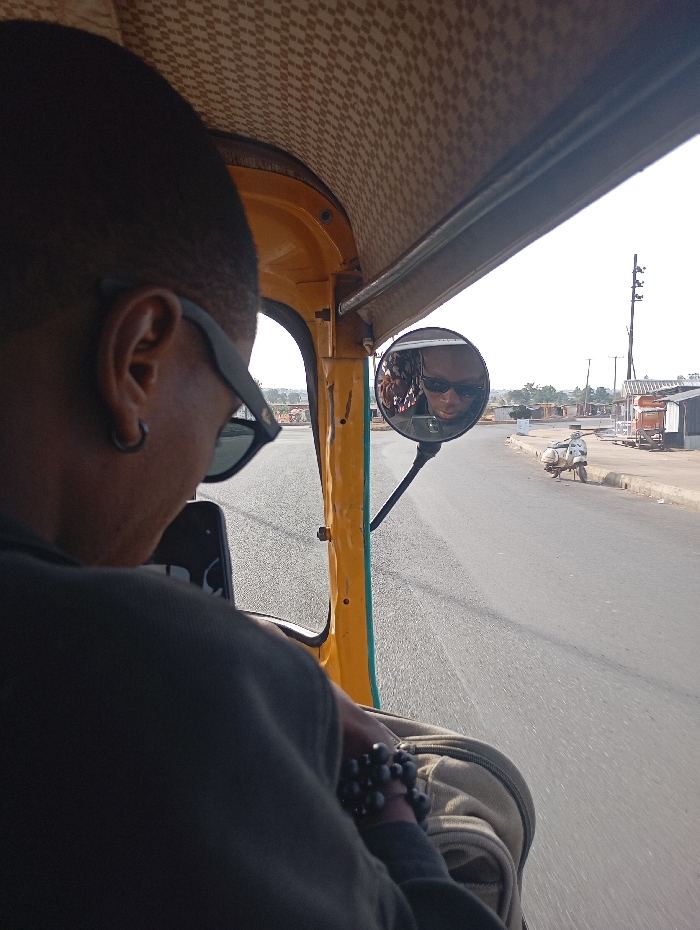 From inside a yellow and tan three-wheeled vehicle, a dark-skinned person with closely cropped hair and sunglasses looks ahead. An earring is visible. A small black cell phone sits in the person's lap. The side mirror shows the reflection of a person with dreadlocks and sunglasses. A moped driver is visible on the side of the road through the vehicle window. Electrical poles are on the side of the road with a building in the background.