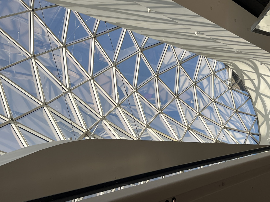 Upward view within the Cloche d'Or Shopping Centre, Luxembourg City, Luxembourg. The primary subject is a large, geodesic-style glass dome skylight, composed of numerous triangular glass panels set within a light-colored structural grid. The glass reflects a clear blue sky. Curved, light-toned architectural elements frame the view on the left and right. The right-side element exhibits distinct, elongated shadows cast by the overhead structural grid, indicating direct sunlight. Indistinct reflections, possibly of interior structures or distant human figures, are discernible within various glass facets. No clearly identifiable individuals or specific actions are present in the immediate foreground.