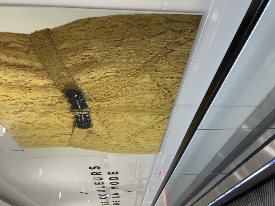 A section of a mustard yellow lace dress with a decorative dark blue and silver embellishment is displayed. The image is taken at an angle, showing part of the dress, the storefront window with French text partially visible, and the escalator's metal and white structure in the background. The focus is on the dress detail and the escalator, indicating an image taken while riding the escalator.