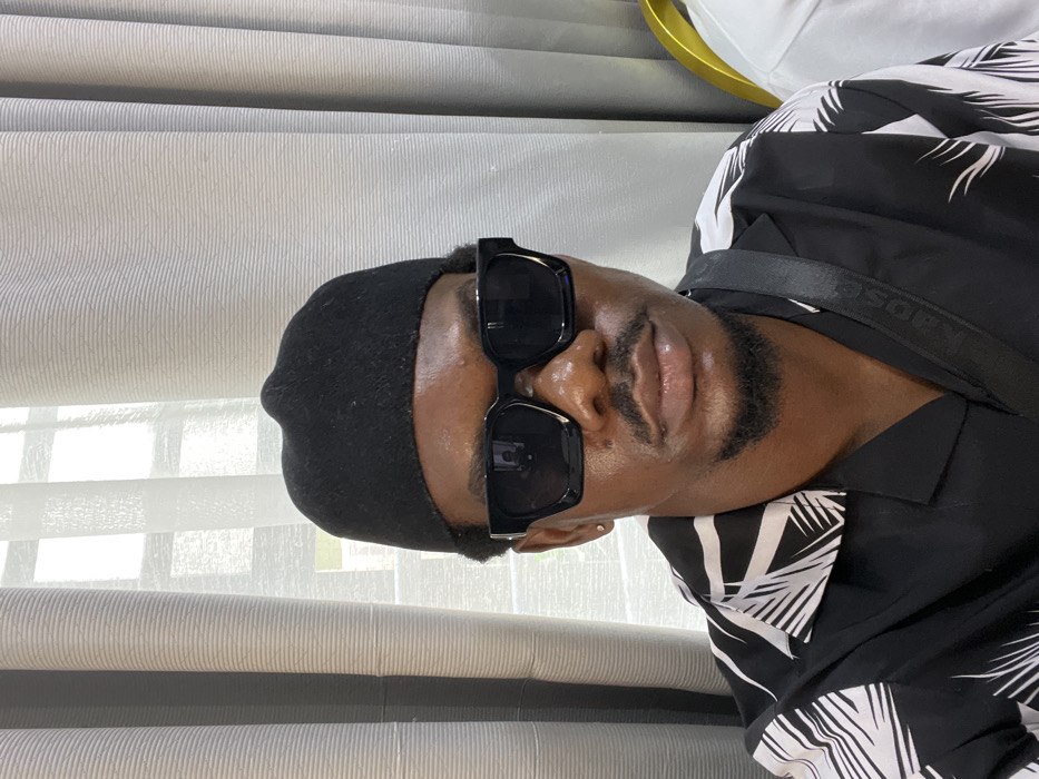 A male individual is depicted in a chest-up, frontal portrait, positioned centrally within an indoor setting in Awka, Nigeria. He possesses a dark complexion, a dark mustache, and a goatee. His head is covered by a black, form-fitting cap. He wears large, rectangular-framed black sunglasses, completely obscuring his eyes. A small, golden stud earring is present in his visible left earlobe. He is dressed in a black short-sleeved collared shirt featuring a white, abstract or foliage-like pattern. A black shoulder strap with light-colored text, possibly "KADS C," diagonally crosses his right shoulder. The background consists of light-beige, vertically ribbed curtains, behind which a window is partially discernible, admitting diffused daylight from the left. A fragment of a gold-colored object, likely furniture, is visible on the far right of the frame. The individual maintains a direct, neutral gaze towards the viewer.