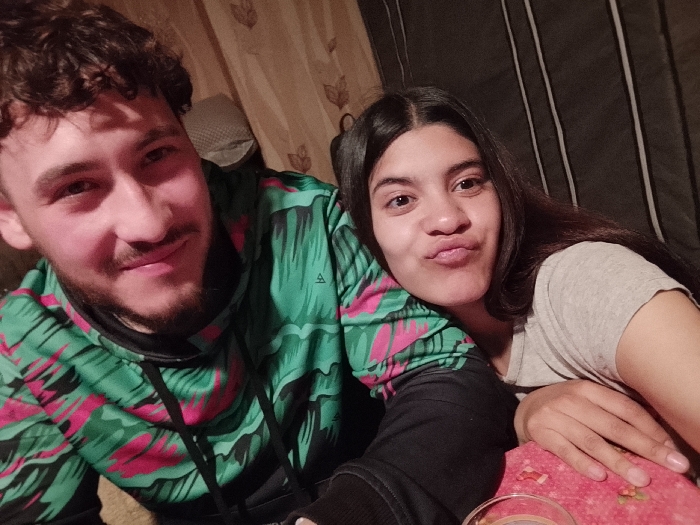 The image displays two young adults in a close-up indoor shot. A male subject, positioned on the left, has dark curly hair, a beard, and smiles towards the camera. He wears a hooded sweatshirt featuring a green, black, and pink abstract pattern. A small white triangular logo is visible on his chest. A female subject, positioned on the right, has long dark hair and makes a "duck face" expression while looking at the camera. She wears a grey t-shirt and rests her head on the male's left shoulder area. Her left hand is visible, resting on a red-pink patterned surface, which also shows a partial view of a clear glass in the lower right corner. The background is indistinct, consisting of a light-brown patterned curtain or wall behind the male and a darker, striped curtain or wall behind the female. The overall lighting is dim. There are no specific identifying features present in the image to determine a precise location within the city of Roman, Bulgaria.