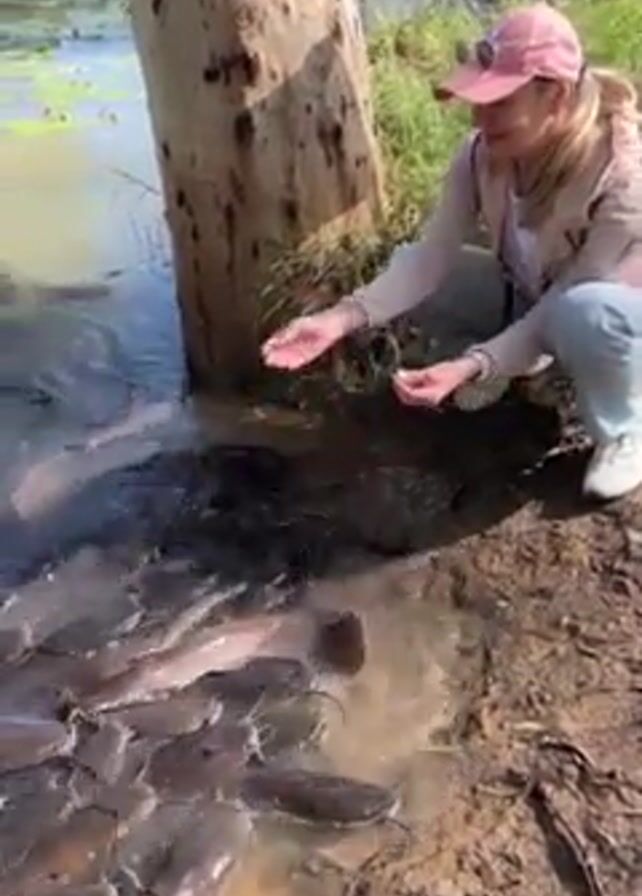A woman is squatting near a body of water, feeding a school of fish. The woman is wearing a pink baseball cap, a light jacket, and jeans. She is holding a small amount of food in her hand and tossing it into the water. The fish are dark gray and appear to be catfish. They are swimming around her hand, trying to get the food. The water is murky and there are some aquatic plants growing in it. A large tree trunk is on the bank near the water, with some dirt and debris on the ground.