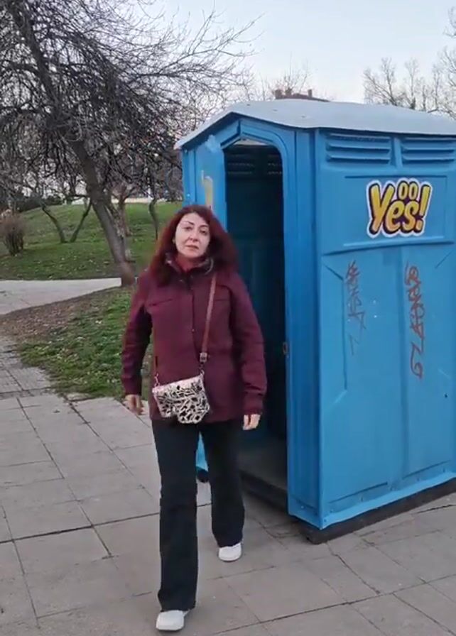 A middle-aged woman exits a blue portable toilet located on a paved walkway in a park-like setting. She is wearing a maroon jacket, dark pants, and white sneakers, and carries a small bag. The portable toilet has "Yes!" stickers on the side along with graffiti. Bare trees and a grassy area are visible in the background. The woman approaches the camera and speaks with a smile.