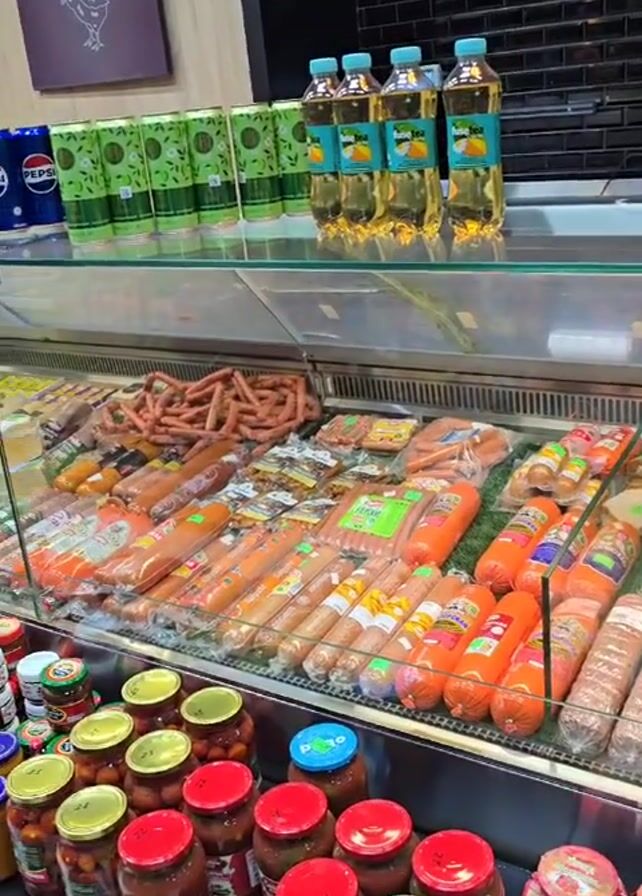 display case in what appears to be a butcher shop or deli. The case is stocked with a variety of food items, including sausages of different types and colors, canned goods like pickled vegetables and sauces, and bottled and canned drinks. The top shelf contains bottles of juice and cans of soda and energy drinks. Above the display case, there are decorative elements, including a sign with animal outlines, a basket of fruit, and overhead lighting. The camera pans upwards to show more of the selection.