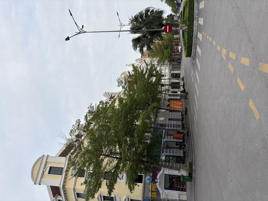 The image depicts a street scene in Bai Chay Ward, Vietnam, under an overcast sky. The foreground shows an empty asphalt road with a dashed yellow line originating from the bottom right and white pedestrian crossing stripes further ahead. To the left, a row of multi-story buildings with European-inspired architecture lines the street. The most prominent is a light yellow building featuring ornate window frames, decorative cornices, and a prominent arched pediment on its upper level. At its base, a storefront with "CA PHE" signage is visible, fronted by an illuminated white archway resembling a booth and an adjacent green trash bin. Outdoor seating with dark tables and chairs is arranged along the sidewalk, in front of several red banners with white text. Green, leafy trees are planted along this sidewalk. Across the intersection, to the right, a central median features manicured green hedges and several palm trees. A red circular "Do Not Enter" sign is affixed to a pole on this median. A tall, black streetlight with two curved arms stands near the sign, with a shorter similar streetlight behind it. More buildings, also in a similar architectural style, line the street on the far right. A white sedan is parked on the right side of the street, and a blue bus or large vehicle is visible further in the distance. The scene is devoid of visible individuals.