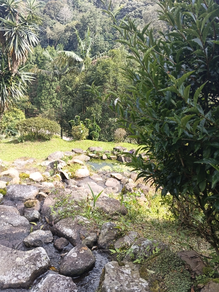 The image displays a verdant outdoor landscape within Laclubar, East Timor. In the foreground, a shallow rocky stream with dark water flows over and around numerous irregular grey and brown boulders, some partially covered by moss and small green vegetation. To the right, a dense green shrub with elongated leaves occupies the immediate foreground, partially obscuring the view. The midground features a small, still pond or wider section of the stream, appearing dark green due to surface vegetation like algae or duckweed, also bordered by rocks. Beyond this water feature, a manicured grassy lawn extends upwards, dotted with smaller bushes. The background is dominated by a dense, multi-layered forest or hillside covered with various types of trees, including prominent palm-like foliage on the far left. No individuals, specific actions, or man-made structures are distinctly visible.