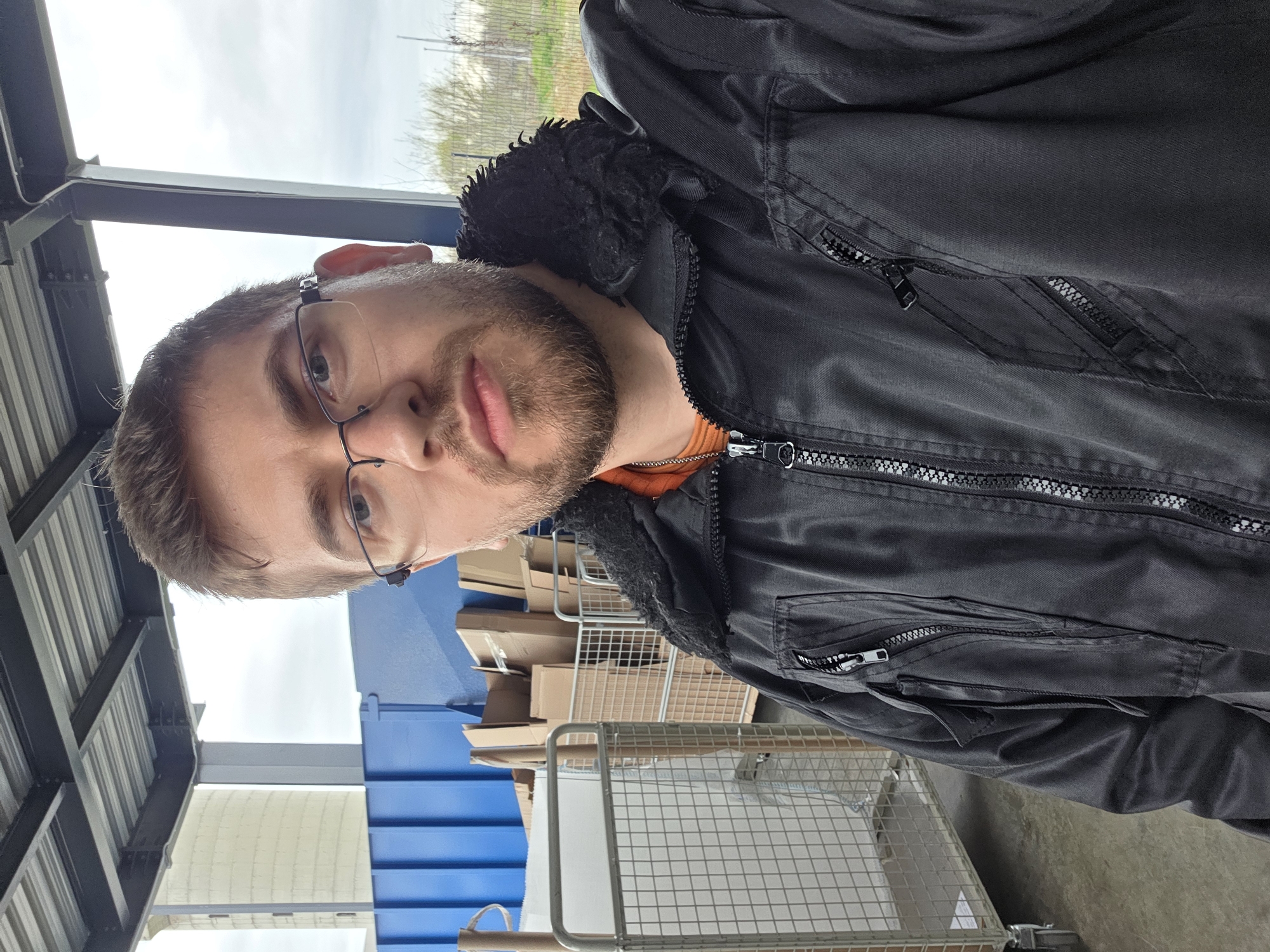A man with light brown hair, a beard, and glasses is wearing a black jacket with a fur-lined hood over an orange top. He is standing near blue containers and wire carts loaded with cardboard boxes. The setting appears to be an industrial or storage area under a metal roof structure. Without further context or specific landmarks, it's impossible to definitively state the location within Plovdiv, Bulgaria.
