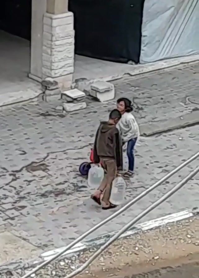 Two children are outside in what appears to be a paved area. One child, wearing a gray sweater and jeans, pushes a small, colorful cart carrying a white and red bucket. The other child, wearing a brown jacket and brown pants, walks alongside carrying a plastic jug of liquid. The ground is wet in places. In the background is a building with a concrete pillar and what appears to be a covered or tarped area. There are also concrete blocks stacked near the building.
