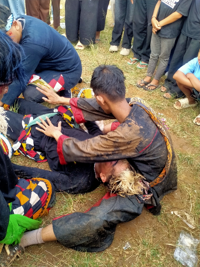 An outdoor scene in Sidomukti, Indonesia, depicts three individuals in the foreground engaged in a physical interaction on a patch of sparse grass and moist brown soil. A person with light-colored, possibly bleached blonde hair, lies prone on the ground, head turned to the left, with dirt matted in their hair. This individual wears a black garment with red accents and a colorful geometric patterned fabric (red, white, black, yellow, green) wrapped around their midsection and left thigh. Their clothing is heavily soiled with mud. White socks and dark shoes are visible on their feet. Kneeling over this prone individual is a male, seen from behind and to the side. He wears a dark, long-sleeved, mud-stained shirt with red trim and a patterned sash (brown/gold and black) draped over his right shoulder. His right hand is placed on the prone person's upper torso, and his left hand is near their midsection, appearing to hold or attend to them. To the left, a third male individual crouches. He wears a dark blue long-sleeved top and dark pants, with a white and red checkered fabric around his waist. His head is bent down, revealing some blue hair or fabric near his left ear, where a small red mark is visible. His hands are positioned near the prone person's upper body. In the background, several other individuals stand or crouch. Their lower bodies are primarily visible, dressed in casual attire including jeans, dark pants, various shirts (one black "ADVENTURE" t-shirt, one light blue t-shirt), and an assortment of flip-flops and sandals. The ground features scattered small pieces of white and purple debris.