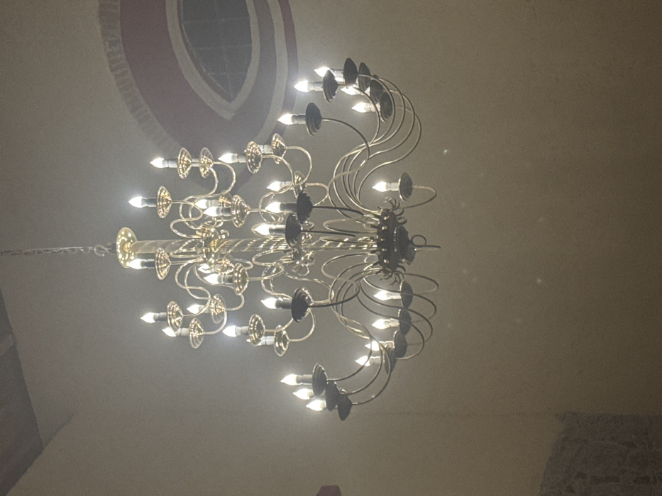 A chandelier with multiple tiers of lights hangs from a ceiling. The fixture features ornate metalwork with curling arms supporting small, bright bulbs. In the background, there's a decorative oval shape outlined in shades of gray. The room has a warm, off-white tone. A glimpse of what appears to be a white, lacy material is visible in the lower right corner.
