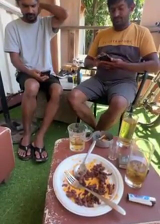 Here is a detailed description of the video: Two men are sitting at a table on what appears to be an outdoor patio. They are both engrossed in their smartphones. The man on the left is wearing a light gray t-shirt, dark shorts, and black sandals. He has his left hand raised, touching the back of his neck. The man on the right is wearing a yellow and black t-shirt and dark shorts. On the table between them, there is a plate of food with leftover meat and some orange sauce, along with a fork and spoon. There are also several glasses containing amber-colored liquid, presumably alcoholic beverages, alongside a pack of cigarettes and a lighter. An ashtray filled with cigarette butts is also visible on the table. The patio has a somewhat cluttered appearance. Behind the men, there is a wall or structure with slats. To the right, a bicycle is leaning against something. The patio flooring appears to be artificial grass. The scene suggests a casual, relaxed atmosphere.