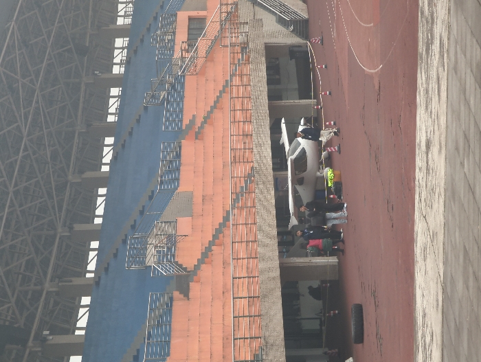 A partial stadium view shows blue seating across from orange levels with metal stairs. A red track runs in front of the seating. A group of people surround a small, white aircraft on the track. There are several orange cones nearby. A tire is visible on the track. The stadium structure is partially visible in the upper left.