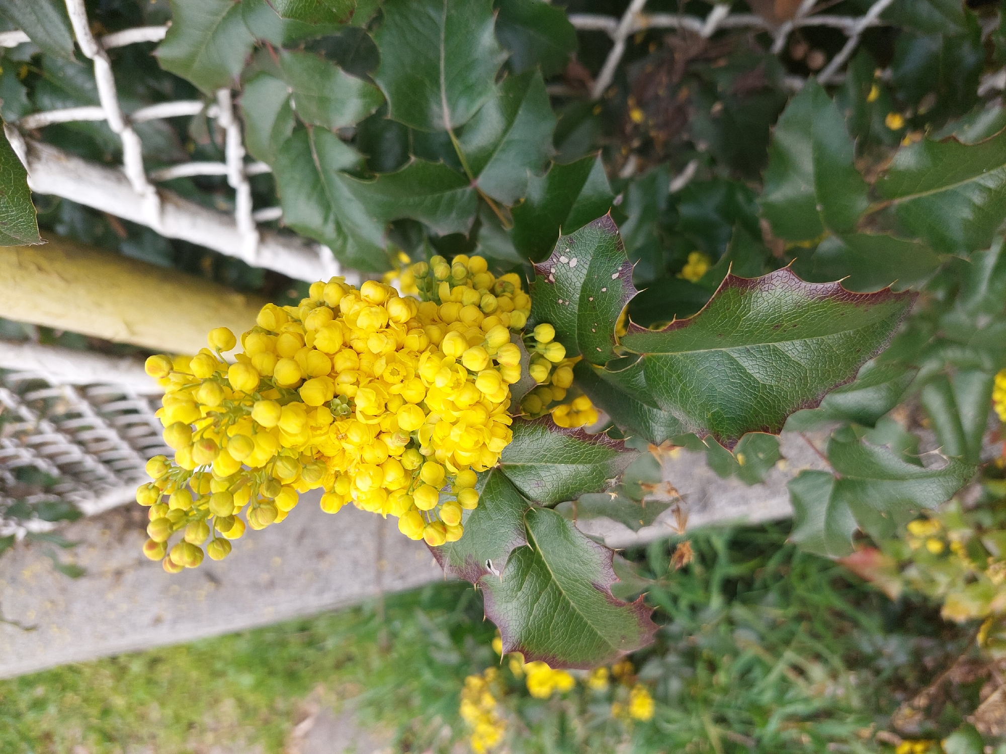 - "A close-up, eye-level shot shows a cluster of bright yellow flowers emerging from green, holly-like leaves with sharp, spiky edges" by FM-sWaGl1, licensed under CC BY 4.0