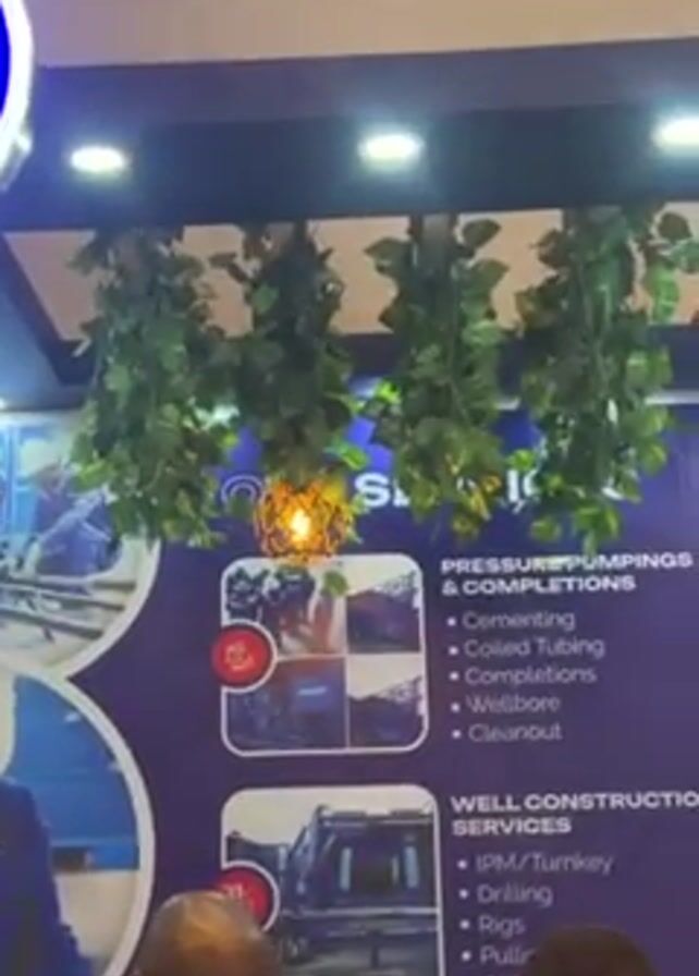 booth at a trade show or convention. The booth has a sign that says "Pressure Pumpings & Completions" and "Well Construction Services". There are two men standing at the booth, looking at something in front of them. The environment appears to be indoors at a commercial event.
