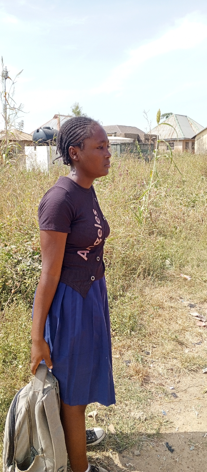 A female individual stands in profile, facing right, in an outdoor setting in Kakau, Nigeria