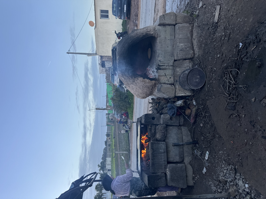 Two outdoor ovens are visible. The first is made of stacked concrete blocks, with a fire burning inside a metal cooking surface. A person in a lilac shirt is tending to the fire. The second oven, also made of concrete blocks, has a rounded adobe-like structure on top, with smoke coming out of its opening. It is placed next to the first oven. Two metal lids are visible on top of the first oven. The surrounding area appears to be a dirt lot near a road.