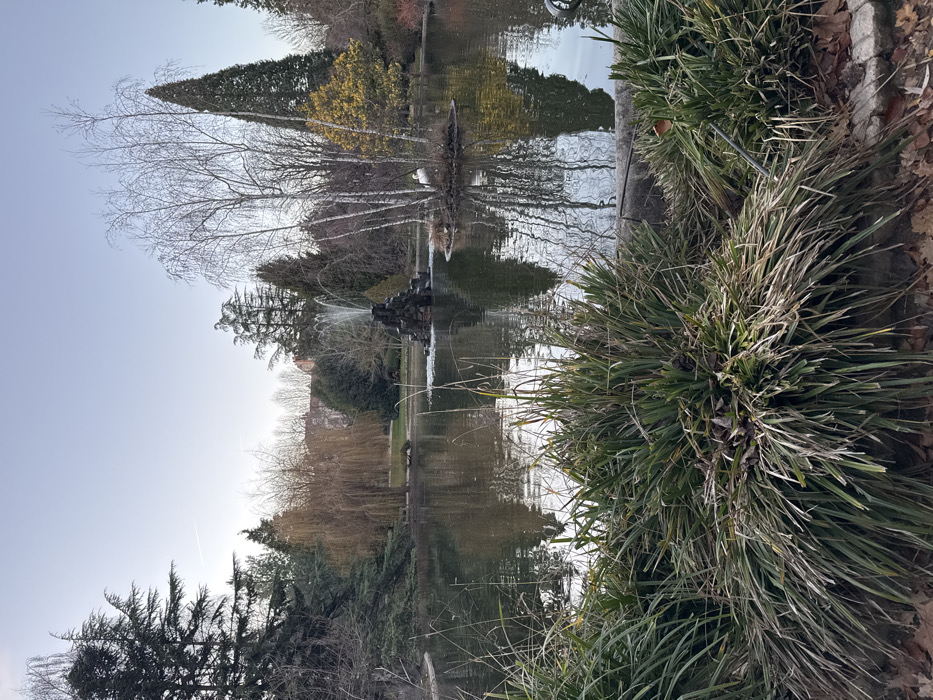 A tranquil park scene features a reflective pond. In the center, a dark fountain sprays water upwards. Bare-branched trees and evergreens surround the pond, mirrored in its calm surface. Lush green grass lines the edge, contrasting with fallen leaves. The sky is overcast, casting a soft light on the serene landscape. A sense of peace and stillness pervades the image.