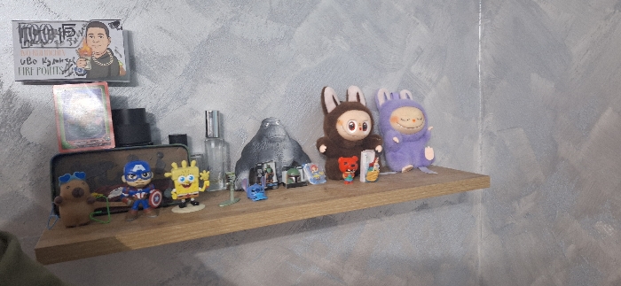 An indoor scene in the city of Studena, Bulgaria, depicts a light brown wooden shelf mounted on a textured grey wall. The wall exhibits a brushed or stucco finish. The shelf holds a collection of assorted figures and objects, arranged from left to right: 1. A small, brown, anthropomorphic figure wearing blue sunglasses, with a green elastic band positioned around its neck. 2. A Captain America action figure, predominantly blue and red, wielding a shield. 3. A yellow SpongeBob SquarePants action figure, depicted with an uplifted hand. 4. A dark, rectangular object, possibly a phone case, serving as a base. 5. A small, framed picture or card with a reflective surface, propped against the rectangular object. 6. A black, cylindrical object is situated behind the framed picture. 7. A clear glass bottle with a silver cap stands upright. 8. A grey, irregular-shaped figure, resembling a stylized rock or abstract sculpture, is placed behind the glass bottle. 9. A small metal stand with a green base. 10. A small blue toy vehicle. 11. Several miniature items, including a black object with white markings and other small figures. 12. A dark brown plush toy with rabbit ears, a white face, and round glasses, holding a miniature red teddy bear figure. 13. A small, light-colored object, possibly a miniature book or box, next to the red teddy bear. 14. A small yellow basket containing colorful miniature items. 15. A light purple plush toy, characterized by rabbit ears, closed eyes, and a serene expression, positioned to the far right. Above the shelf, affixed to the grey wall, is a rectangular sign or poster. It features a cartoon depiction of a man with a gold chain, holding a burning object. Text in Cyrillic and English, including "100 P1S," "IVO KRYCHUK," and "LIKE POINTS," is visible on the sign.