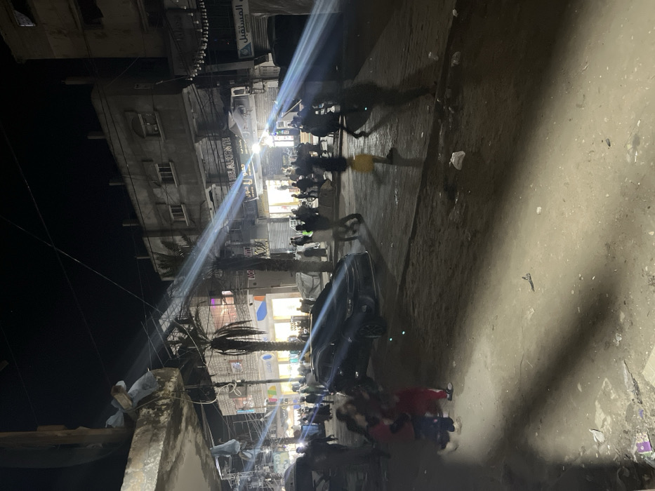 A dimly lit street scene at night reveals a group of people gathered together. The buildings lining the street are aged and appear to be in disrepair, with visible power lines adding to the urban ambiance. A dark-colored car is parked along the side of the street, reflecting the nearby lights. The ground is uneven and shows signs of wear and tear. The overall atmosphere is one of urban decay.