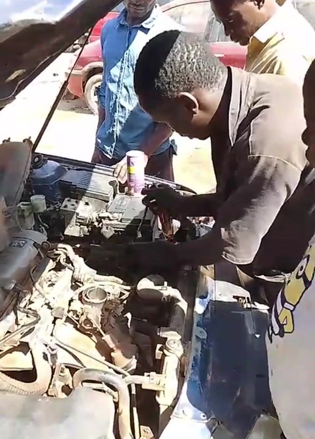 Three men stand in front of a car with its hood open. One man is leaning over the engine, apparently working on it. Another man stands behind him to the left, wearing a light blue shirt and a baseball cap. The third man, with dark hair, stands behind the man working on the engine, to the right. There is a can of some sort of product on the inner car frame. The engine is visible under the open hood. A red car is parked behind the blue one. The setting seems to be outside in daylight.