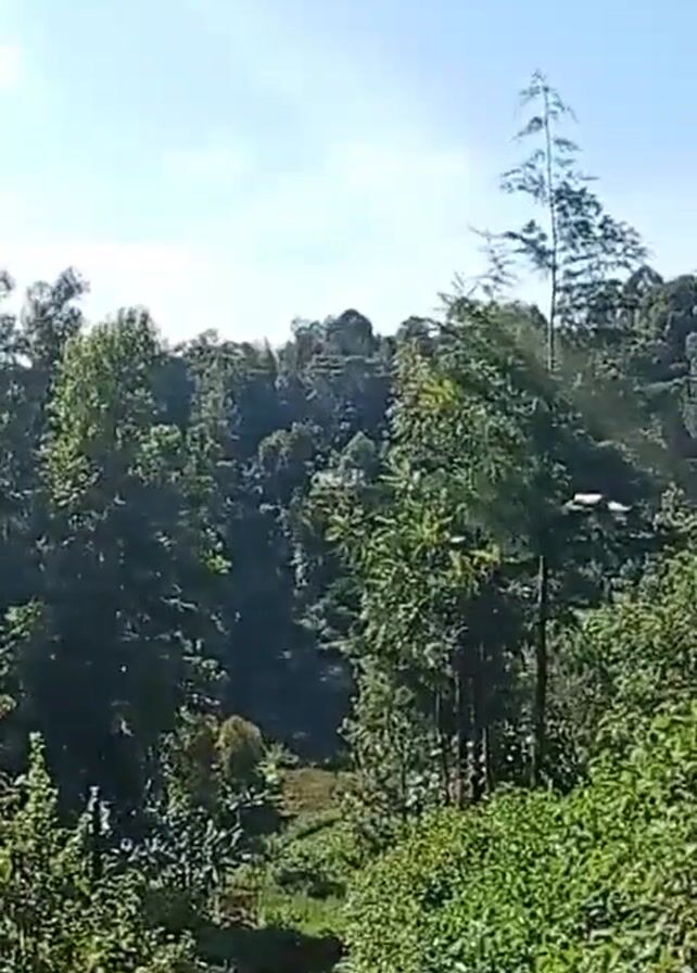 slightly elevated view of a path winding downhill through a lush, green landscape. The path is a reddish-brown color, likely made of dirt or soil. Dense vegetation, consisting of various trees, shrubs, and plants, lines both sides of the path. The trees have dense canopies, creating a shadowed effect in some areas. The sky is a clear, bright blue, with a few wispy clouds visible. A faint sun glare is present in the upper left of the frame. Overall, the scene portrays a natural and peaceful outdoor environment.