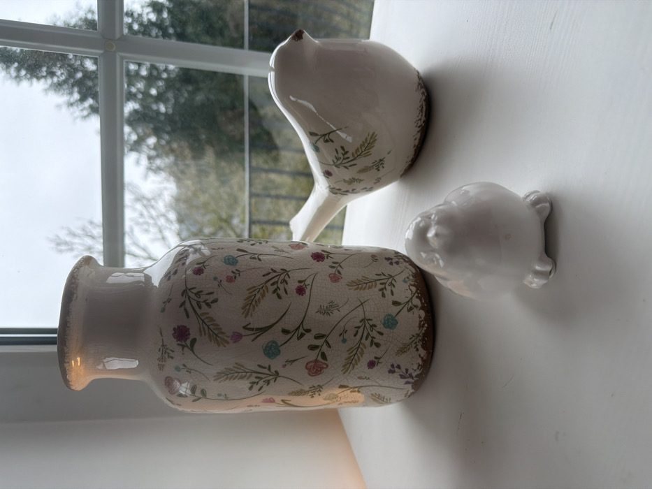The image displays an indoor scene located in Trassem, Germany, featuring three decorative ceramic objects arranged on a white surface, likely a windowsill. On the left, a tall, off-white ceramic vase with a crackled glaze and a distressed base is present. The vase is adorned with a pattern of scattered small multi-colored flowers and green-brown leafy stems. To the right of the vase, a larger, off-white ceramic bird figurine, similarly decorated with subtle floral and leaf motifs on its body, faces towards the right. In front of the vase and to the left of the larger bird, a smaller, smooth, solid white ceramic bird figurine is positioned. All objects are static. Behind these items, a multi-paned window with white frames reveals an outdoor environment under an overcast sky. The background consists of a treeline containing both deciduous trees, mostly bare, and dark green coniferous trees. A dark-colored railing, possibly part of a balcony, is visible between the foreground objects and the distant trees. Natural light from the window illuminates the scene. No individuals are depicted, and no explicit actions or interactions are occurring.