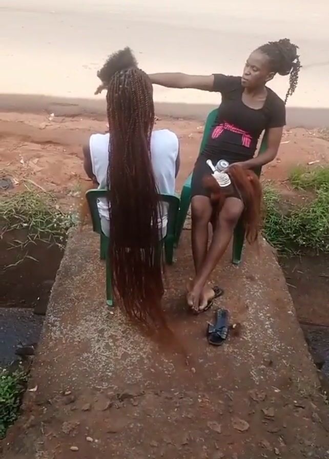 Two women are sitting on green plastic chairs on a concrete bridge, with one styling the other's hair. The woman having her hair styled is wearing a white tank top and has long, dark brown braids. The woman styling her hair is wearing a black t-shirt and dark skirt. She has her hair pulled back in a bun and is holding a comb. Extra braiding hair is sitting on the chair next to her. A pair of black sandals are on the bridge. The scene is set outdoors with a road and vegetation in the background.