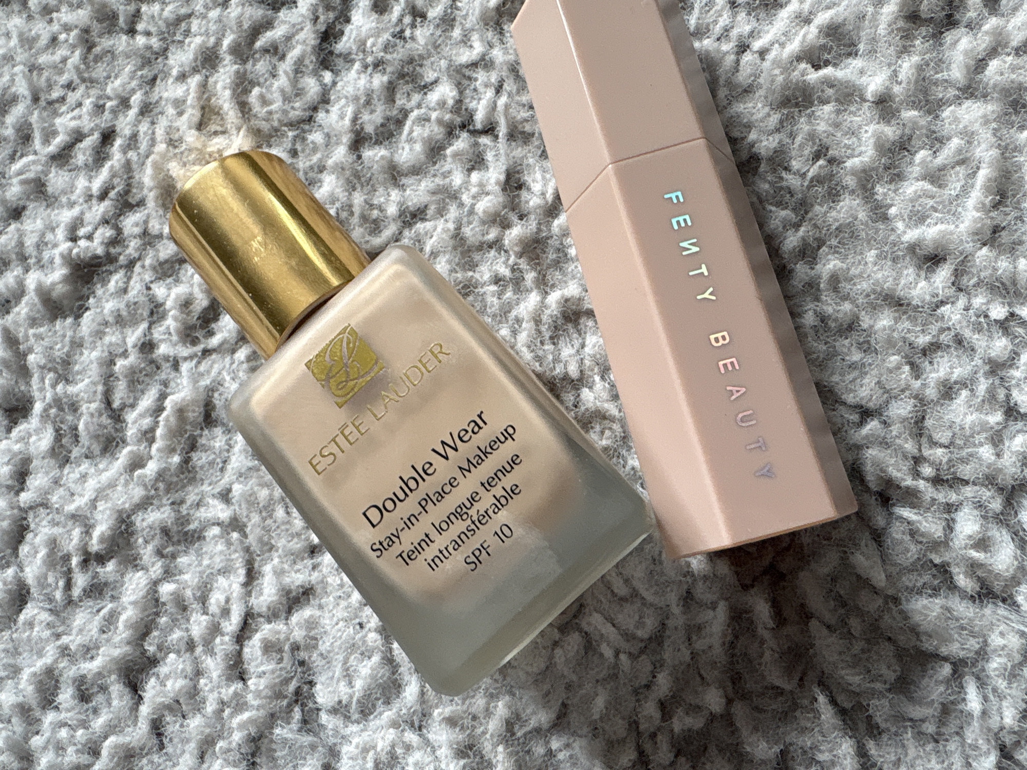 two bottles of makeup on a gray, textured surface. On the left is a rectangular bottle of Estée Lauder Double Wear Stay-in-Place Makeup with a gold cap. The bottle is mostly opaque, but the label is visible, displaying the brand name and product information in black lettering. To the right is a taller, hexagonal bottle of Fenty Beauty product in a matte, nude color. The brand name, "FENTY BEAUTY," is printed vertically on the side of the bottle. The textured surface beneath the bottles appears to be a fabric with a dense, looped pile. There is no indication in the image that it is in Cheshnegirovo, Bulgaria.