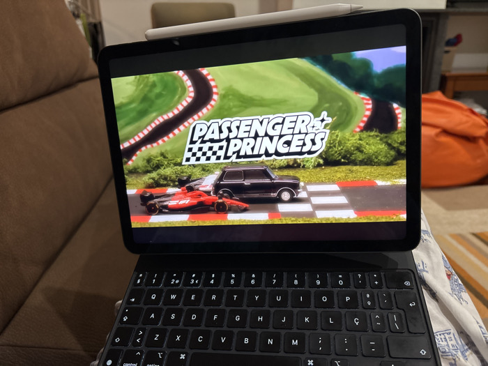This image depicts an iPad displaying media, resting on a black keyboard case, situated on a patterned fabric, likely a blanket on a lap, within a domestic interior. The location is the city of Unknown, Unknown. **Subjects/Objects:** The primary subject is a dark-colored iPad, equipped with a black keyboard case featuring a QWERTY layout with European character accents (e.g., 'Ç'). A white Apple Pencil is magnetically attached to the top edge of the iPad. The iPad's screen displays a vibrant, simulated miniature race track scene. This scene includes green, undulating terrain, a brown race track with red and white striped borders, a red Formula 1-style race car positioned on the left side of the track, and a dark-colored classic car (resembling a Mini Cooper) positioned to its right. The title "PASSENGER & PRINCESS" in white block letters, with a checkered flag pattern embedded in the "PRINCESS" section, is prominently displayed in the upper center of the screen. **Environment:** The immediate environment for the iPad is a light-colored blanket or fabric with dark patterns. In the blurred background to the left, a portion of a brown, upholstered couch or armchair is visible. To the right, an orange beanbag chair is present, followed by a light-colored wooden furniture piece, likely a side table or shelf. The overall lighting suggests an indoor setting. **People/Actions/Interactions:** No individuals are directly visible in the scene. The presence of the iPad and its accessories suggests a user is either watching content or about to interact with the device. No explicit actions or interactions are captured.