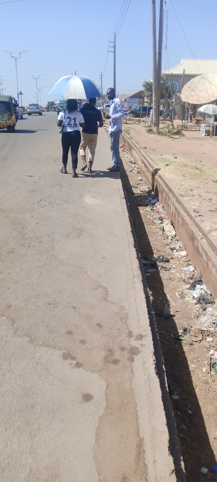 The image depicts a daytime scene on a paved road in Sabon Tasha, Nigeria, under a clear blue sky