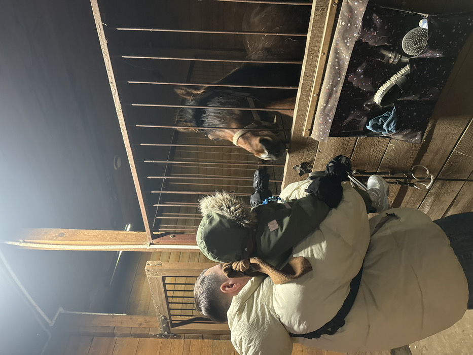 The scene depicts an interior view of a stable in Kalinovo, Russia. A person, identified as an adult male, is observed from the back, wearing a light-colored puffy winter jacket and dark trousers. He is holding a small child, also viewed from the back, dressed in a dark green hooded winter jacket with fur trim, black gloves, and light-colored footwear; a brown scarf or similar garment is visible around the child's neck. Both individuals are positioned facing a horse stall constructed of wooden planks and vertical metal bars. Inside the stall, a brown horse with a dark mane and forelock, wearing a light-colored halter, stands facing the adult and child. The horse's head is visible through the upper section of the stall bars, appearing to interact or observe. To the left, another wooden stall door is partially visible. To the right of the horse stall, a multi-pocket fabric organizer, patterned with white dots, hangs on the wooden wall, containing various grooming tools such as brushes and cloths. Below this organizer, horse tack components, possibly bits or stirrups, are suspended from the wall. Overhead, artificial lighting illuminates the wooden ceiling and structures.