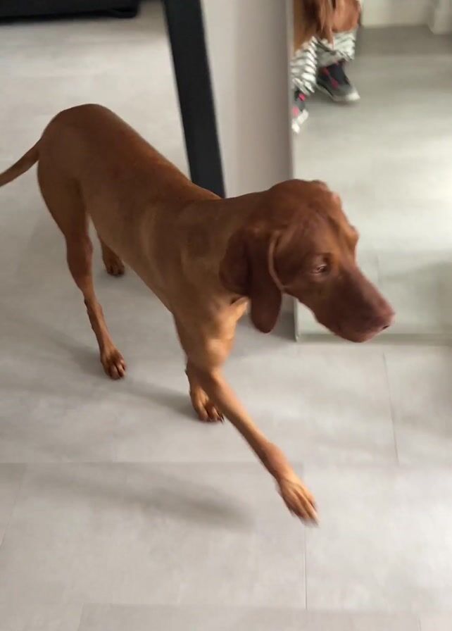 - "A Vizsla dog is walking in a room with white tiled flooring" by FM-PeREE2, licensed under CC BY 4.0