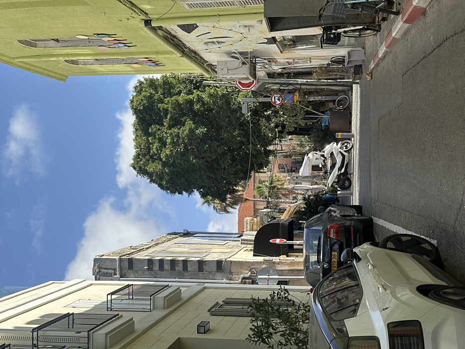 The image presents a static daytime view of a narrow urban street in the Neve Tzedek neighborhood of Tel Aviv-Yafo, Israel