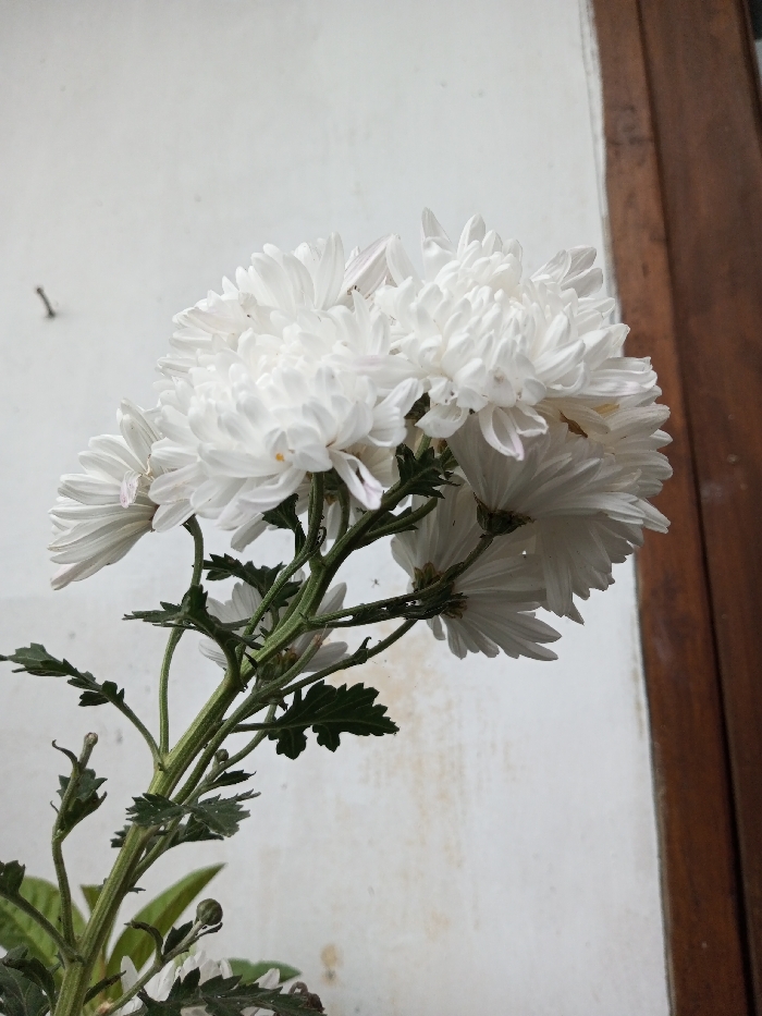 A still life photograph, captured in Ciherang, Indonesia, presents a cluster of white chrysanthemum flowers. The central subject comprises multiple densely packed white blossoms, each with numerous overlapping petals; some petals exhibit faint yellow or pinkish discolorations. Below the flower heads, robust green stems branch out, adorned with dark green, serrated leaves. The background consists of a plain, light-colored wall on the left side, showing subtle texture and a small dark protrusion (likely a nail or screw) in its upper-left section. To the right, a vertical strip of dark brown wood, consistent with a door or window frame, is visible. The scene is illuminated by ambient light. No individuals or animals are present, and no active interactions or movements are depicted.