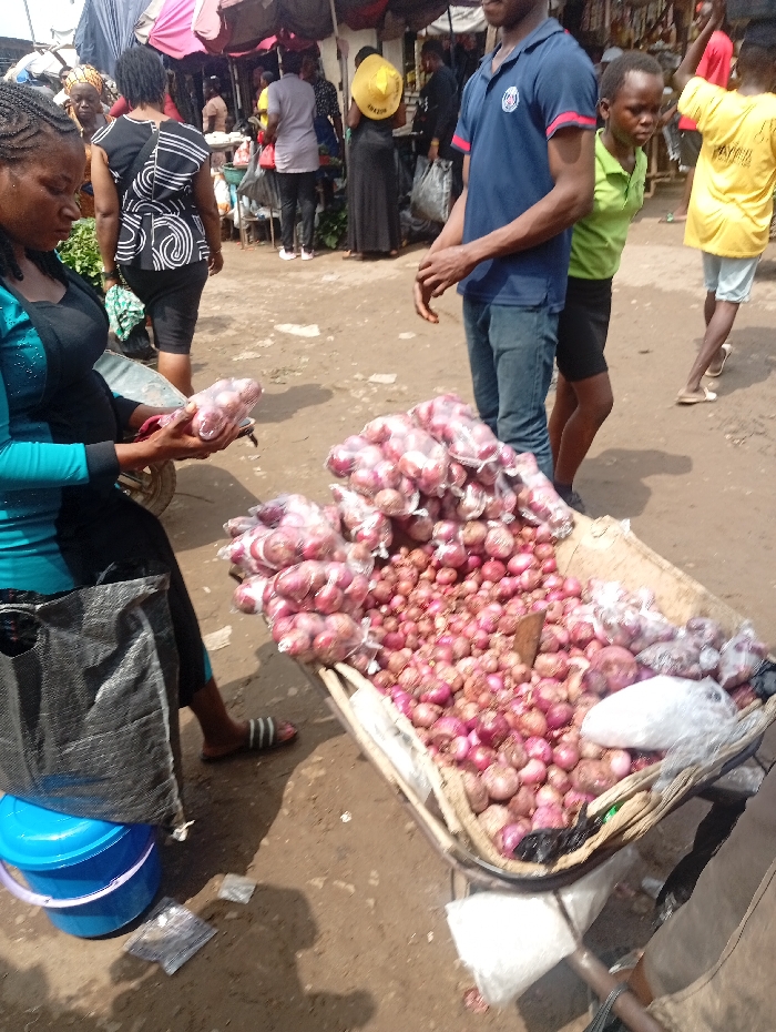 A woman in a market sits on a blue bucket, holding a bag of onions. Next to her, a wheelbarrow overflows with loose and bagged onions. Two men stand nearby, one in a blue shirt and jeans, the other in a green shirt and black shorts. People walk in the background. The scene appears to be a bustling market setting.