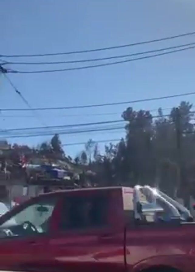 The video, shot from a moving vehicle, shows a roadside view of a densely populated hillside. Many small structures, some of which appear to be temporary dwellings, are visible on the hillside, interspersed with trees. The Chilean flag is visible in several locations. Debris and construction materials are scattered around the hillside. Several vehicles, including a white van and a truck carrying portable toilets, can be seen on the road. Power lines and utility poles are visible overhead. A sign that says "Se recibe ayuda" (Help is received) is partially visible. The sky is clear and blue.