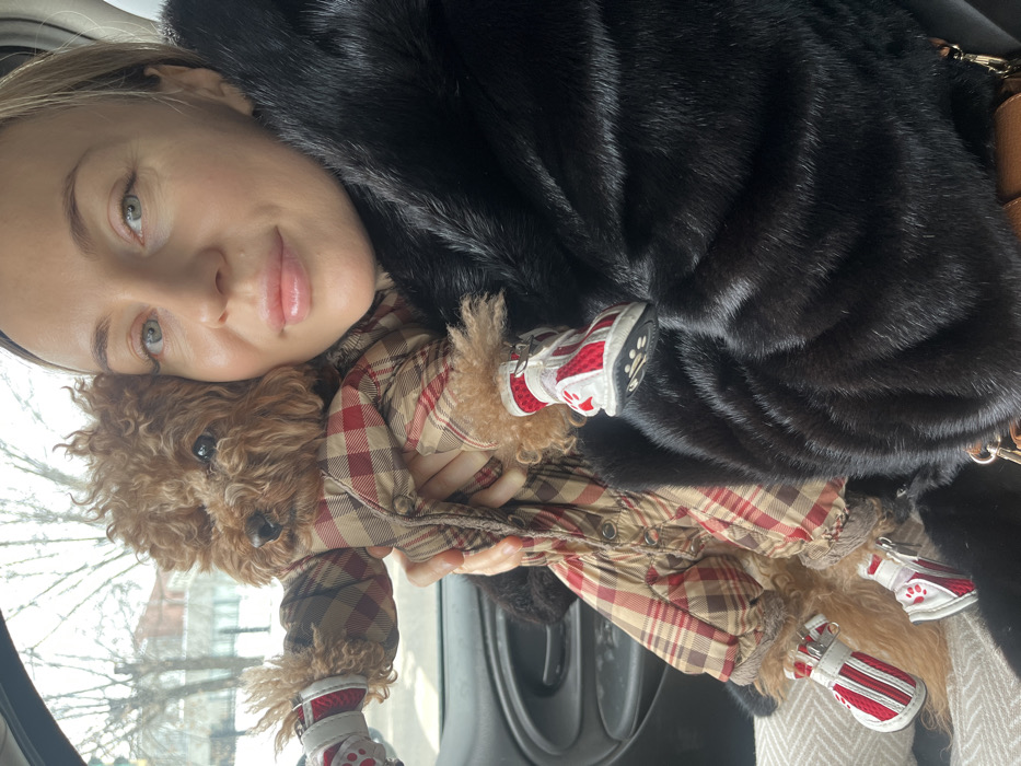 An adult female, positioned in the right foreground, presents a subtle smile towards the camera. She has blonde hair, light eyes, and wears a dark, possibly black, fur coat. A small, reddish-brown curly-haired dog, resembling a Poodle, is held by the female. The dog is clad in a tan, red, and brown plaid full-body suit with faux fur trim, and all four paws are fitted with red and white boots featuring white soles with black paw print patterns. The scene takes place inside the passenger compartment of a vehicle, evidenced by the visible dark interior trim and a door handle on the left. Through the vehicle's window, a blurred outdoor environment in Podolsk, Russia, is visible, characterized by bare trees and light-colored ground, suggesting a winter or early spring setting. A building facade is faintly discernible in the background.