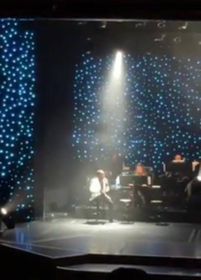 A man in a white jacket is sitting on a stool onstage, singing. A spotlight shines on him, and there are musicians behind him. The stage has a blue starry background. The audience is visible in the foreground.