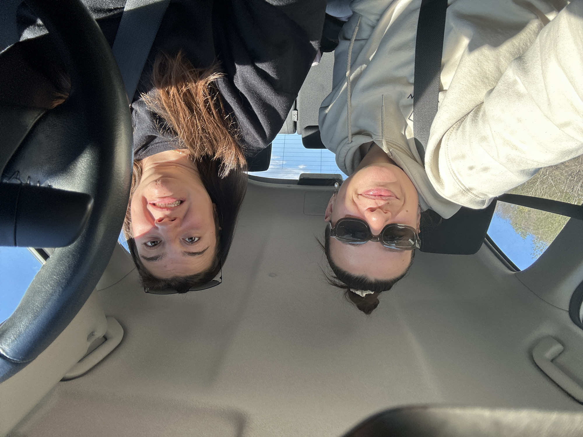 Two women are seated in the front seats of a car, with the image presented from an upside-down perspective