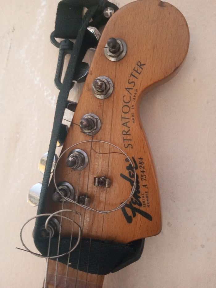 A close-up of a Fender Stratocaster headstock. The wood is light brown, showing wear and tear. "STRATOCASTER MADE IN JAPAN" is printed in black. The Fender logo, also in black, curves above "SERIAL NUMBER A 754284." Tuning pegs are visible, along with loose, coiled strings. A black guitar strap is partially visible. The background is a plain light beige wall.